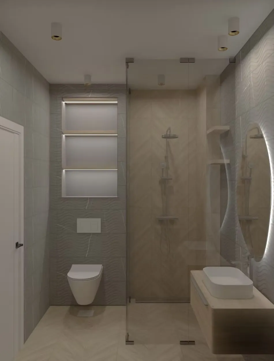 На първия етаж се намират отворена всекидневна, трапезария и модерна кухня, а вторият етаж е предназначен за спалните и личните пространства. Баните са стилни и практични, с интегрирани ниши и стъклени прегради. Тази къща предлага комфорт и съвременен стил за цялото семейство.